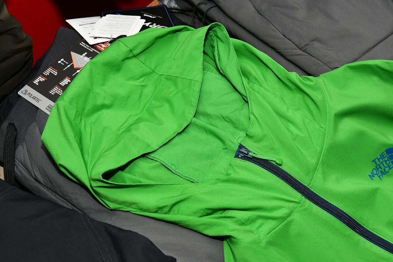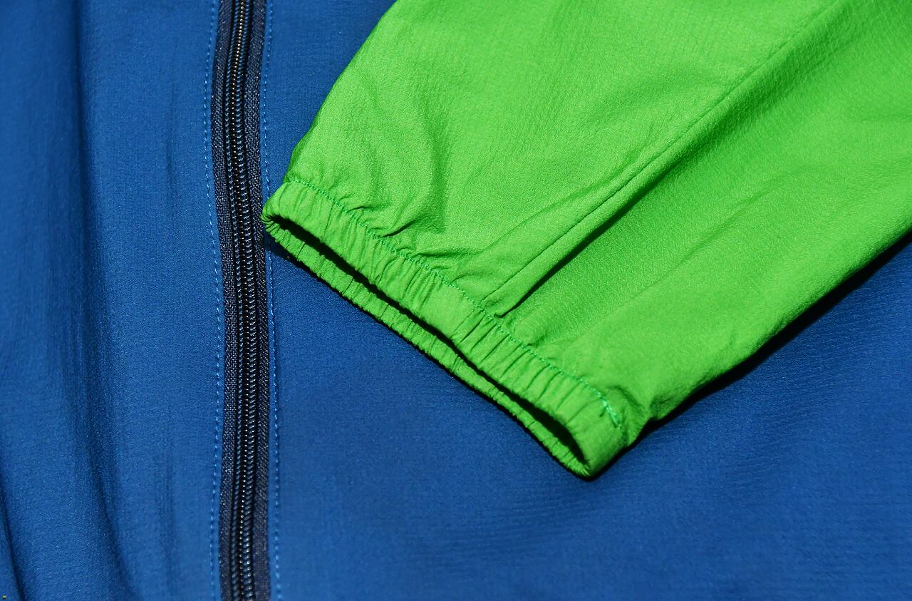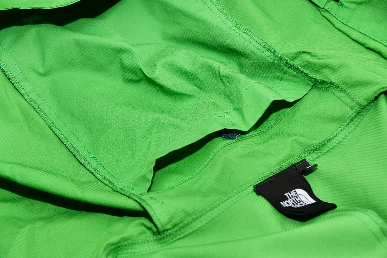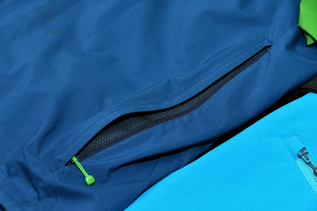 右ポケットは2重構造 フード内に本体収納用ポケット 背面切り返し部にベンチレーション機能 ストレッチ