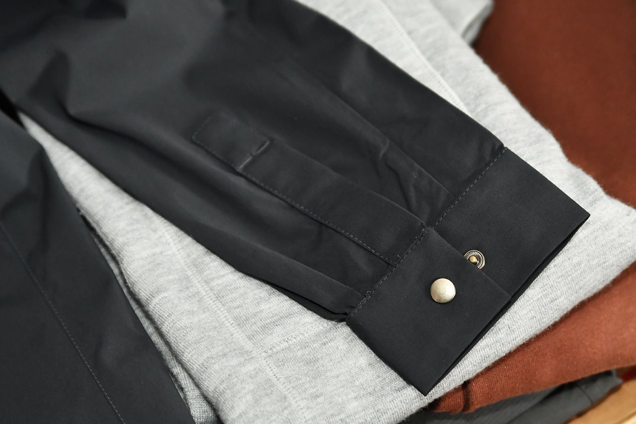 ストレッチをする薄手のソフトシェル生地 左胸にファスナー付きポケット(ベンチレーション機能兼務) 袖はボタンを留めると半袖で使用出来る2WAY仕様