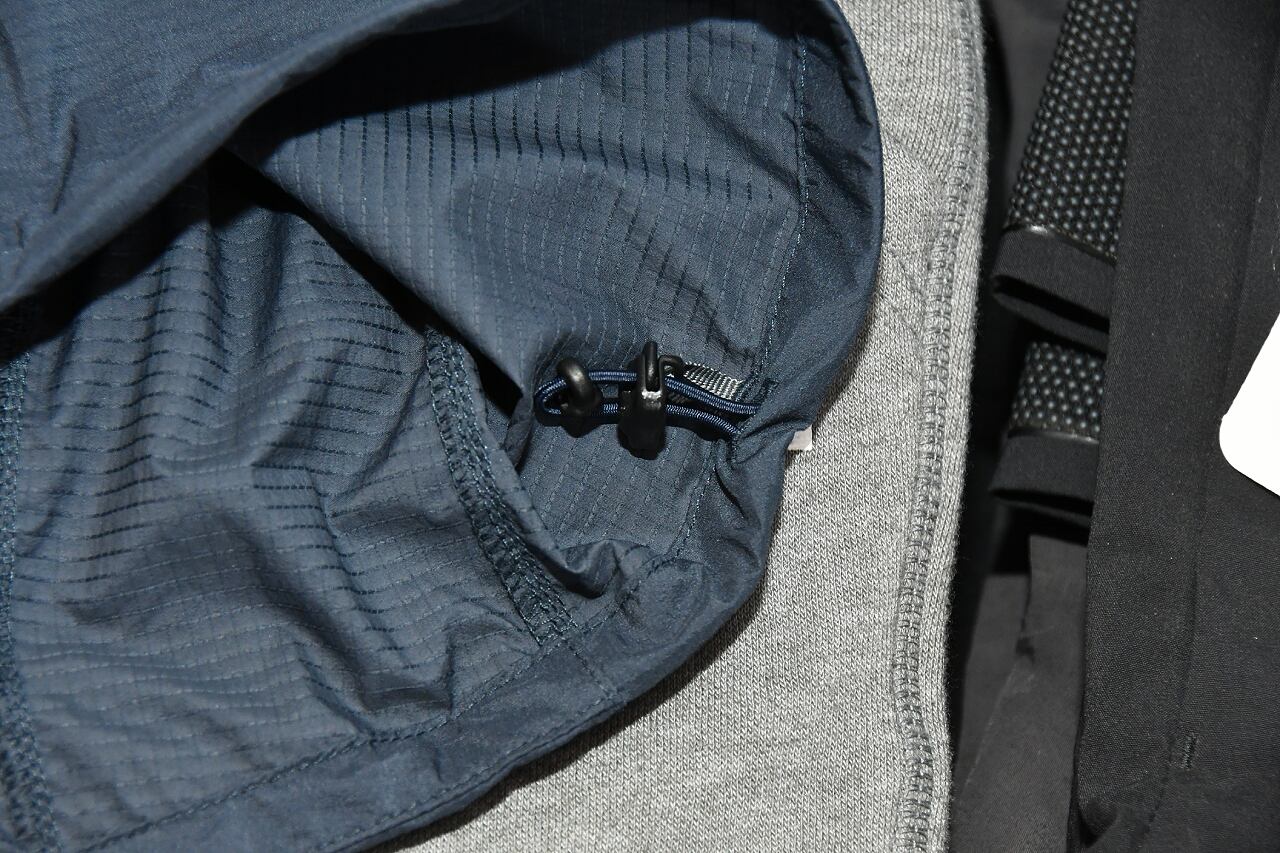 EXOLITE 45 double weave 20dn Soft Shell fabric ポケットは胸の1カ所のみでパッカブル仕様 裾にドローコード フード調整用にベルクロ 裏地は薄っすらとグリッド形状